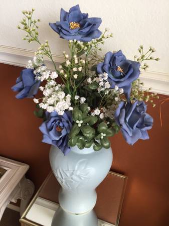 24” total hight. Gorgeous blue vase with silk blue flowers arrangement. In great condition. Call: .