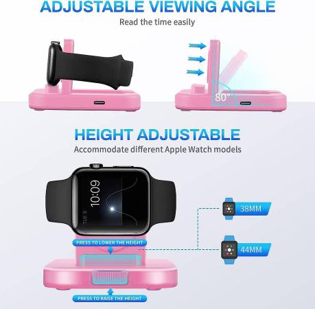 Compatible with All Apple Watch Models: angle adjustable charger stand widely compatible with Apple Watch Series 8, Ultra, 7, 6, SE, 5, 4, 3, 2 (including 38mm 40mm 42mm 44mm 41mm 45mm 49mm version) (Note: Not support series 1.)