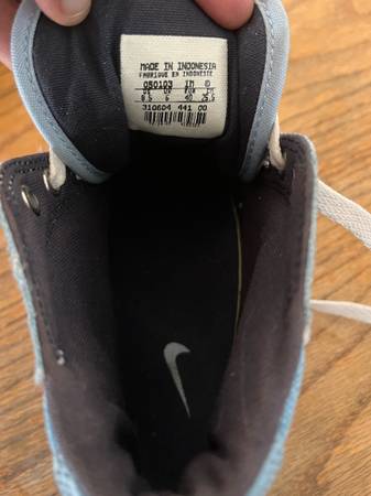 High desert South Adelanto pick up- Woman’s Nike Blue Flower Print Material Real Tall High Tops Shoes size 8 1/2. Seems like was not even used in great condition with soft super clean black material inside cushion. Real white shoelaces & outer side soles with brown grip bottoms is shown in all pictures to check out details.