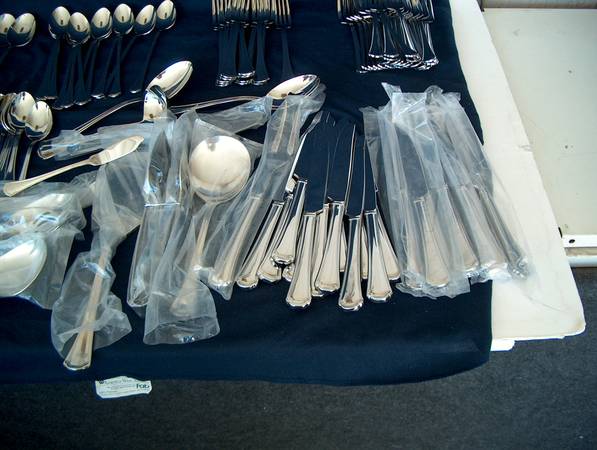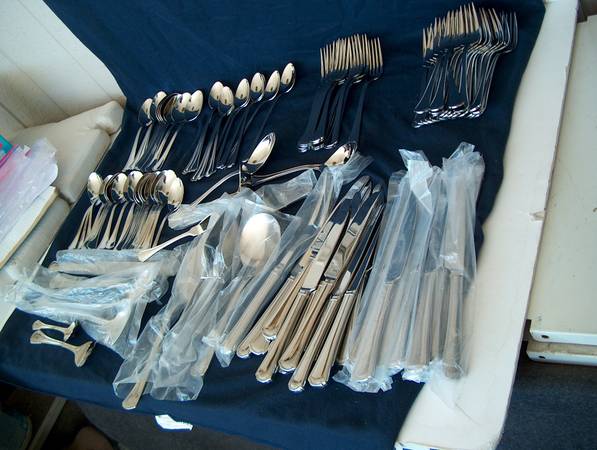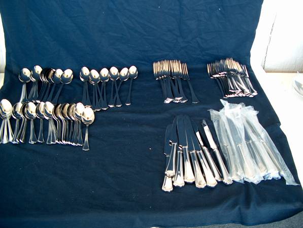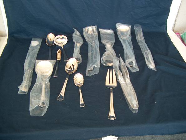 STAINLESS STEEL SET FOR 12 PLUS . INCLUDES ACCESSORIES. SEE LIST. GLOSSY. NEW , NO BOX THABHS... CAB