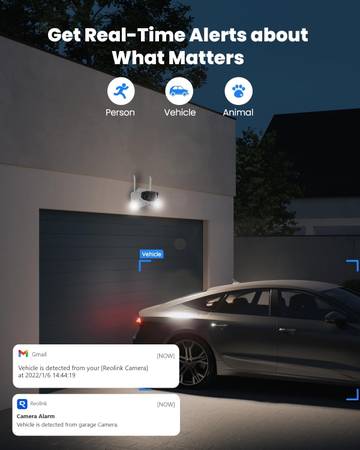 SMART DETECTION WITH 24/7 RECORDING: Featuring advanced AI detection, this IP camera distinguishes between person, vehicles, and animals to deliver more relevant alerts by push/email through Reolink App/Client.