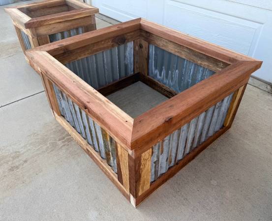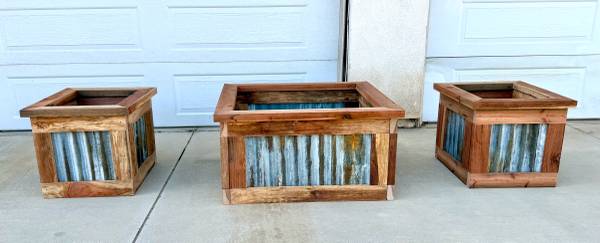 Set of three rustic planters. These are bottomless planters made from corrugated metal and redwood. The metal has a faux patina finish to make it look weathered and aged. The redwood is weathered fencing. These planters have country charm and would bring visual intrigue to any outdoor or indoor space. Like any wood planter the redwood would need to be waterproofed for outdoor use to extend the lifespan of the planter. The 2 smaller planters measure 20 inches tall x 22 inches wide x 24.5 inches deep. The larger planter is 20 inches tall 37.5 inches wide x 35 inches deep. $350 for the set. Or will sell separately $125 for each small one and $200 for the larger one.