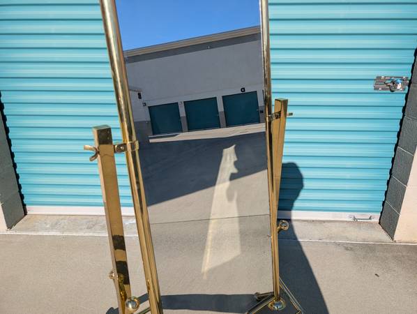 The warm brass frame reflects light beautifully, adding depth and sophistication to any space. As shown in the photo, the mirror has a commanding vertical profile with clean lines and balanced proportions, making it ideal as a statement piece while remaining highly practical. The dual-sided mirror design allows for easy use as a dressing mirror, bedroom cheval mirror, or dramatic accent in an entryway or living space.