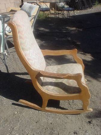 rocking chair wood frame upholstered seat and back good condition rocker 39 inches tall 33 1/4 inches long 24 1/2 inches wide $65.00 call