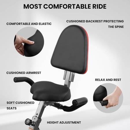 Designed for All Sizes: Exercise bike is meticulously crafted to accommodate a diverse range of heights, catering to individuals measuring from 4'9" to 6'1". The stationary bike’s adjustable large seat cushion ensures optimal posture and alignment, which are indispensable for achieving a successful and comfortable workout experience. The adjustable features of the recumbent exercise bike also make it convenient for every member of the family to use, catering to each person's fitness needs