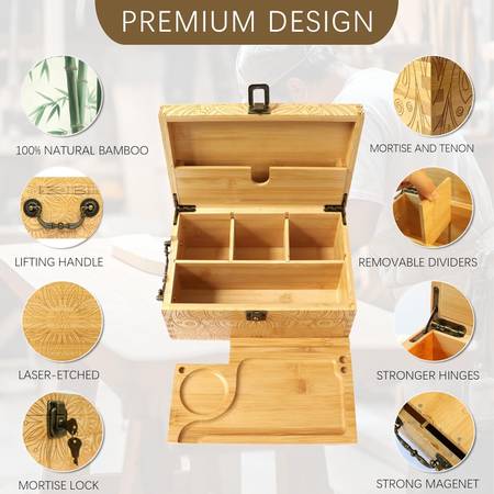 【PREMIUM BAMBOO BOX TRAY SET】We hooked you up with high-quality accessories to use right out of the box. The Stash Box Set includes 3 glass jars with lid, 3 storage tubes, a removable bamboo tray, a grinder card, 3 smell proof bags and a cleaning brush. The side is equipped with a carrying handle to facilitate travel. Enjoy exceptional value for your money.