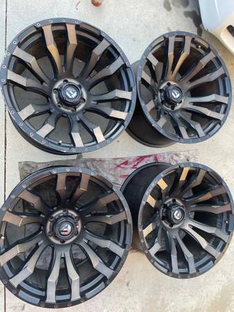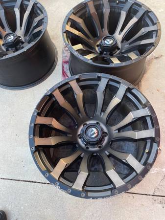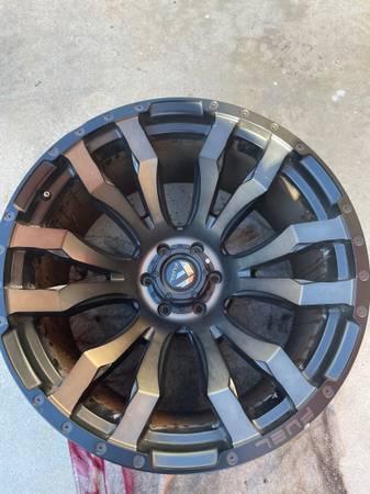 In great shape very minor wear , I had them 37’ tires got compliments every where it’s like a black w bronze very different the offset is awesome they make your ride look on steroidss well each was $685 out the door was $2,900 only asking $1,700 firm . I’m in Moreno Valley by Alessandro Blvd/ Perris Blvd