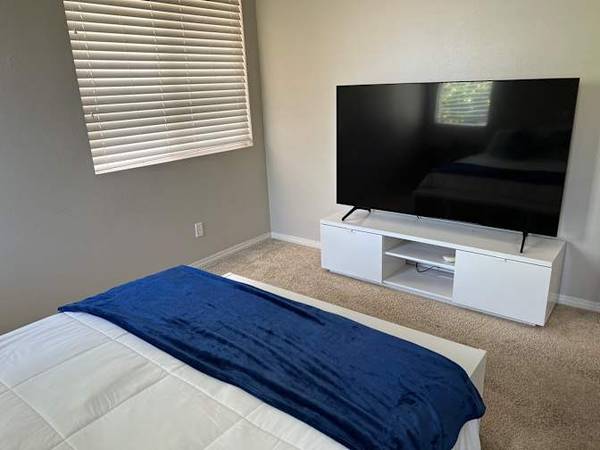 Peaceful downstairs en suite room in a spacious 5bd 5ba house located in a beautiful community. The room features a spacious walk in closet, partial carpet flooring, private bathroom within room, fast wifi, and more, nice views of the pool and backyard. The pictures certainly do not do it justice. House is in a great culdesac location in between the I-15 and the 215, feels like it’s in its own nook. Parking is not of issue. There are no neighbors on one side of the house. Full privileges to yards, pool (during operating months), kitchen, laundry, A/C, and common areas. Our ask is mutual mindfulness, and courtesy of cleaning up of all areas/items used. Additional rental fees for tenancy of 2 more accordingly, pets, etc. please inquire so we can work things out.