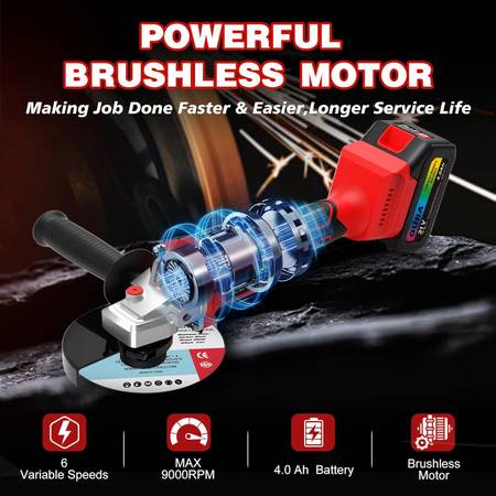 🔥[Super Power Up to 9000RPM]: 21V Angle grinder brushless motor provides up to 9000RPM for a wide range of applications such as grinding metal, rust removal, metal/steel cutting, metal polishing. High-power brushless motor has longer use life, Stronger motivation smaller loss of battery energy, lower machine running noise level and much safer working conditions.