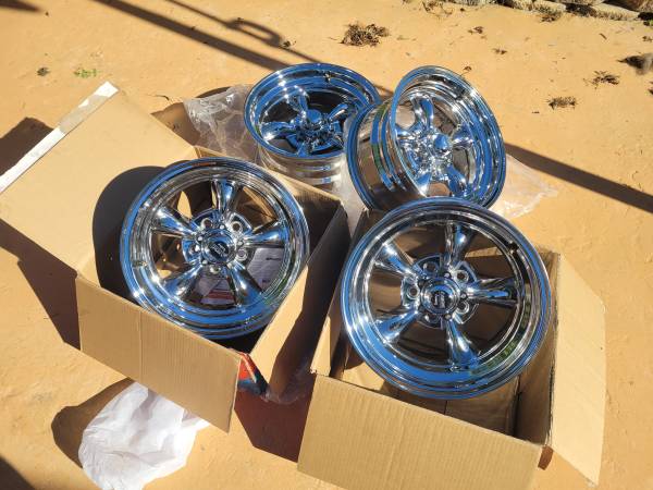Staggered 15×7- 15×8 5 lug. New in boxes, chrome not polished.